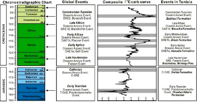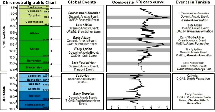 Figure 1. The main Oceanic Anoxic Events (OAE’s) discussed in the text and identified worldwide as well as in Tunisia, a tentative correlation with the events which occurred in Tunisia during the Mezosoic (Jurassic - mid-Cretaceous). Timescale, global events and carbon isotopic data are compiled from Jenkyns (2010).
