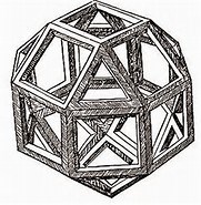 Le polyèdre suspendu, à gauche de l’image, est un rhombicuboctaèdre de verre à moitié rempli d'eau. (Tableau attribué à Jacopo de Barbari 1495). A droite, une représentation du polyèdre par Leonard de Vinci =>