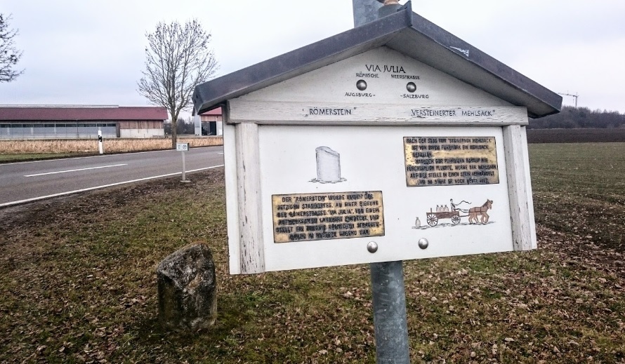 Tatsächlich lässt sich ein Stein an der Unterbergerstraße finden, allerdings handelt es sich bei dem Stumpf nicht um einen Mehlsack, sondern um eine römische Hinterlassenschaft. Vor vielen Jahrhunderten führte eine Straße der antiken Eroberer durch Mering und das nördlich gelegene Kissing.
