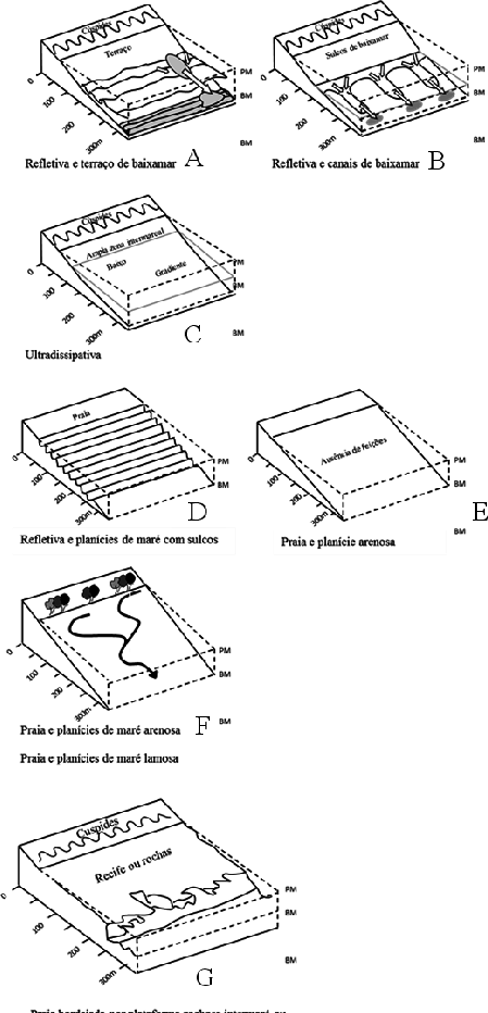 Estas praias são caracterizadas por uma face da praia relativamente estreita e íngreme, composta por areia grossa e uma zona de rebentação estreita.