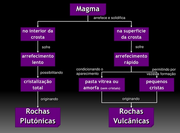 Magma si raffredda e si solidifica all'interno della crosta sulla superficie della crosta soffre veloce di raffreddamento lento condizionata consentendo l'aspetto talvolta consentendo la formazione completa cristallizzazione o pasta di vetro amorfo (non cristalli) piccole creste originarie