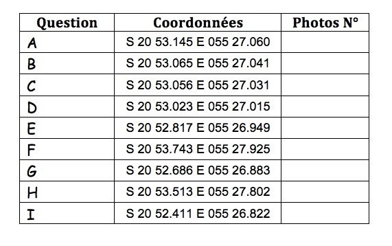 Avec l’aide du tableau ci-dessus relevez aux waypoints indiqués le chiffre correspondant à la photo (A= X) et ainsi de suite.