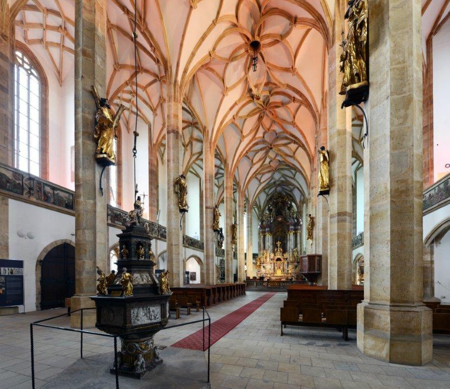 Gotický kostel byl vystavěný po požáru města v roce 1515 podle plánů Rejtova žáka Jakuba Heilmanna ze Schweinfurtu na místě raně gotické baziliky. Ze staršího kostela se dodnes dochovala pouze krypta. Stavba nového chrámu, zasvěceného Panně Marii, byla zahájena roku 1517 a trvala až do začátku 17. století.