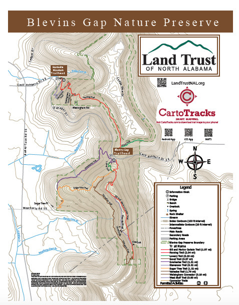 Blevins Gap Nature Preserve is 971.12 acres of scenic vistas, rock overhangs, trails, and pristine forest. It features a 10.5 mile trail system. Called Huntsville's own “Little Applachian Trail,” the Preserve contains the southernmost remnant of the Space Walk Trail created by Boy Scouts in the 1960's that ran from Monte Sano State Park to the south end of Green Mountain. The northern portion of the Preserve holds the first piece of property donated to Alabama's first land trust (now the Land Trust of North Alabama) in 1988. These acres now feature the Stevenson and Fanning trails named for the first land donors.