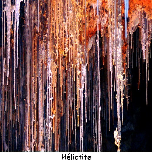 Une hélictite ou un excentrique est un spéléothème prenant une forme ramifiée, spiralée ou courbée. À la différence des stalactites, les gouttes d'eau à l'origine de la structure en déposant le carbonate de calcium qu'elles contiennent ne se détachent pas et restent sur place jusqu'à évaporation complète. Une telle formation peut croître dans toutes les directions. Les excentriques sont des concrétions ne respectant pas toujours les lois de la pesanteur, d’où des formes les plus étranges qui soient : volutes, boucles, aiguilles, aux directions multiples et aux angles divers.