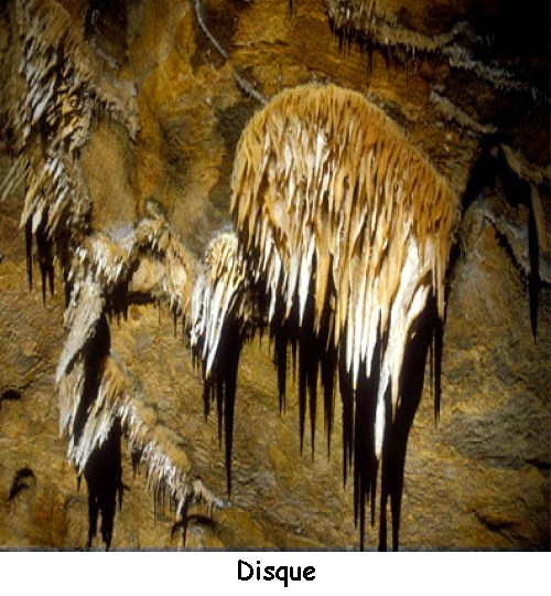 Les disques sont des concrétions plates, circulaires se projetant, soit obliquement, soit perpendiculairement aux parois de la grotte. Les dimensions sont de l’ordre de quelques centimètres d’épaisseur et du mètre pour le diamètre. Ce spéléothème reste rare. La formation des disques.