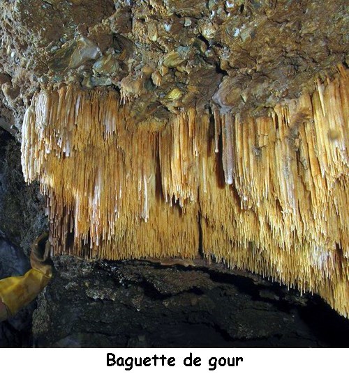 Un gour est une concrétion en forme de barrage en travers d'un écoulement souterrain. L’eau souterraine dissout le calcaire du sous-sol. Cette eau peut s’évaporer lorsqu’elle est amenée à stagner dans une cavité préexistante : elle fait des "flaques" d’eau. La concentration en calcite augmente et celle-ci se dépose aux abords de la "flaque" en augmentant le niveau de l’eau.