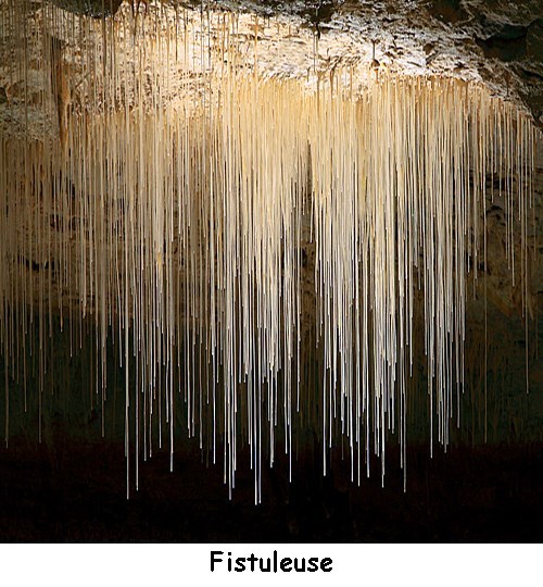 La fistuleuse est parfois appelée familièrement macaroni. Ce sont des stalactites provoquées par un écoulement de très faible débit. Chaque goutte d’eau dépose avant sa chute une très fine couche annulaire de calcite qui se dispose immédiatement sous la précédente. Ainsi naît une concrétion tubulaire descendante, alimentée par l’intérieur. Elles ont la forme d’un tube creux très fin (5 à 8 mm), très fragile, mais pouvant atteindre exceptionnellement plusieurs mètres de longueur.