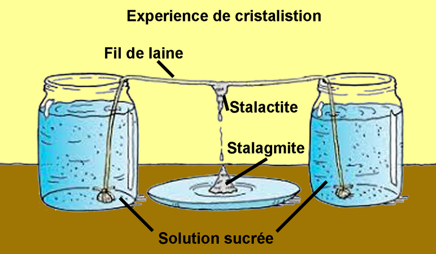 Il est simple de reconstituer le phénomène de concrétion. Prenez deux verres dans lesquels vous avez dissous du sel, tendez un fil de laine entre les deux, laissez-le pendre en dessous du niveau de l’eau. Avec l’évaporation, les cristaux de sel se reforment après deux-trois jours. Bref, le début du commencement de la formation de concrétions.