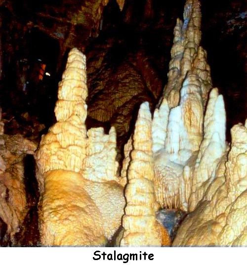 Les stalagmites se forment en sens inverse lorsqu'une goutte d'eau calcaire s'écrase sur le sol, tombant goutte à goutte d'une stalactite, libère ce qu'il lui reste de carbonate de calcium.