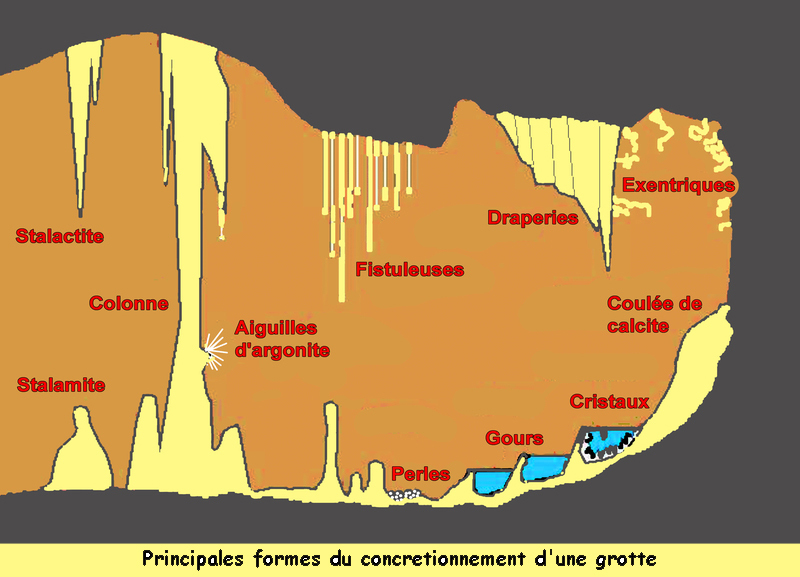 Résultat : le calcaire se dépose au plafond, puis juste en dessous du calcaire qui s'est déjà déposé. Petit à petit, sur des périodes de plusieurs centaines d'années, grandit, tête en bas, des concrétions ! En zone tempérée, elles peuvent parfois être marquées par des cernes annuels. Elles peuvent être colorées par les sels métalliques dissous par l'eau dans la roche (oxydes de fer, cuivre, manganèse, etc.) Elles se forment à des vitesses très variables (de quelques centimètres par an à moins d'un millimètre par millénaire, selon la teneur de l'eau en sels minéraux, selon le débit de l'eau et selon la vitesse d'évaporation ou la présence de bactéries dans un biofilm qui peuvent accélérer le phénomène de cristallisation. Elles sont en grande partie responsables de l'attrait touristique des cavités souterraines.