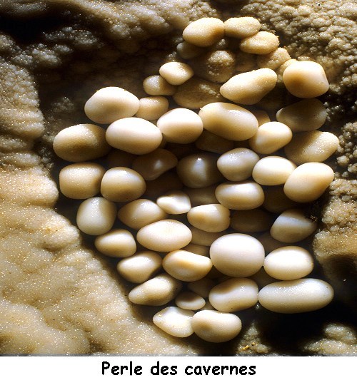 Une perle des cavernes désigne une sphérule, forme de spéléothème que l'on peut trouver à l'intérieur des grottes. Elles se forment par la concrétion de sels calciques qui s'agencent en couches concentriques autour d'une particule nucléatrice (un grain de sable, par exemple) dans des zones où l'eau ruisselle vigoureusement. Les perles des cavernes (ou pisolithes) Lorsqu’un petit grain de roche est prisonnier d’un petit bassin, l’arrivée régulière d’un filet d’eau dans ce bassin peut le faire tournoyer sur lui-même. La calcite se déposant régulièrement sur toute sa surface, on finit par obtenir une petite perle plus ou moins sphériques .