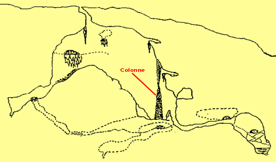 D’accès difficile, elle donne accès verticalement à une grande salle de plan ovale (27 m x 15 m), dont le grand axe suit la direction de la diaclase, et de 25 m de profondeur sous le niveau de la surface. Sur le pourtour, s’ouvrent de petites salles. Près de l’extrémité occidentale de cette diaclase se trouve un large pilier stalagmitique, sous l’ouverture de la cavité.