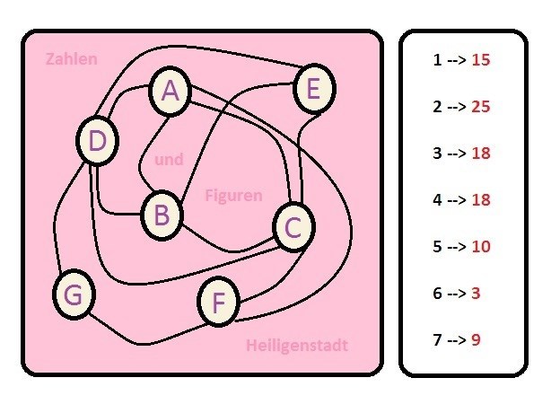 Trage in die sieben leeren Felder (A-G) die Zahlen 1 bis 7 ein. Jede Zahl ist mit anderen verbunden; wenn Du die mit ihr verbundenen Zahlen zusammen zählst, ergibt sich die rechts vom Pfeil angegebene Summe (rote Zahlen). Jede Zahl darf nur einmal vertreten sein. Welche Zahlen gehören nun in die Kreise, damit die vorgegebene Summe erreicht wird ?