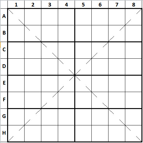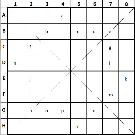 - Jede Zahl von 1 bis 8 nur einmal je Diagonalen.