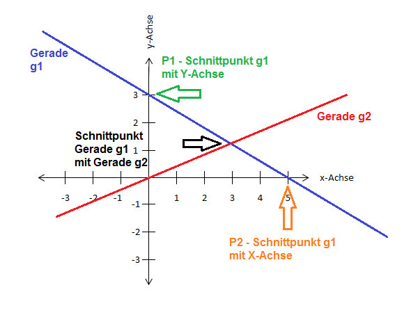 Der Schnittpunkt der Gerade g1 mit der Y-Achse ergibt Punkt P1 (x1 ; y1) (siehe grüner Pfeil) und der Schnittpunkt mit der X-Achse ergibt Punkt P2 (x2 ; y2) (siehe oranger Pfeil) .