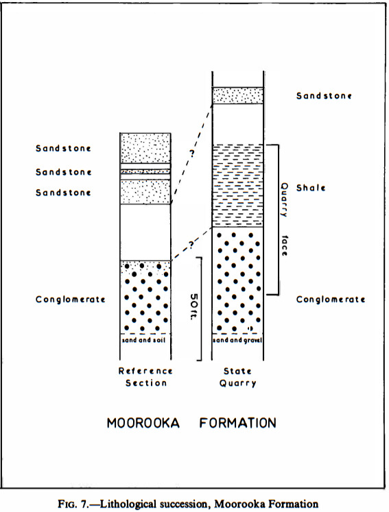 The best exposure is in the Slacks Creek State Quarry where 40 feet of shales and partly carbonaceous shales overlie the conglomerate. In other areas lacking shale outcrops, the vertical distance between the top of the conglomerate and the lowest sandstone bed is 15-25 feet. The shales are succeeded by medium- to very coarse-grained protoquartzites and some subgreywackes, with minor granule and pebble conglomerates. A few finer, thin-bedded, more micaceous sandstones (lithic greywackes) are interbedded with the coarser, more mature members. The sandstones may be vertically continuous but outcrop in a maximum of six layers forming small cliffs and escarpments.