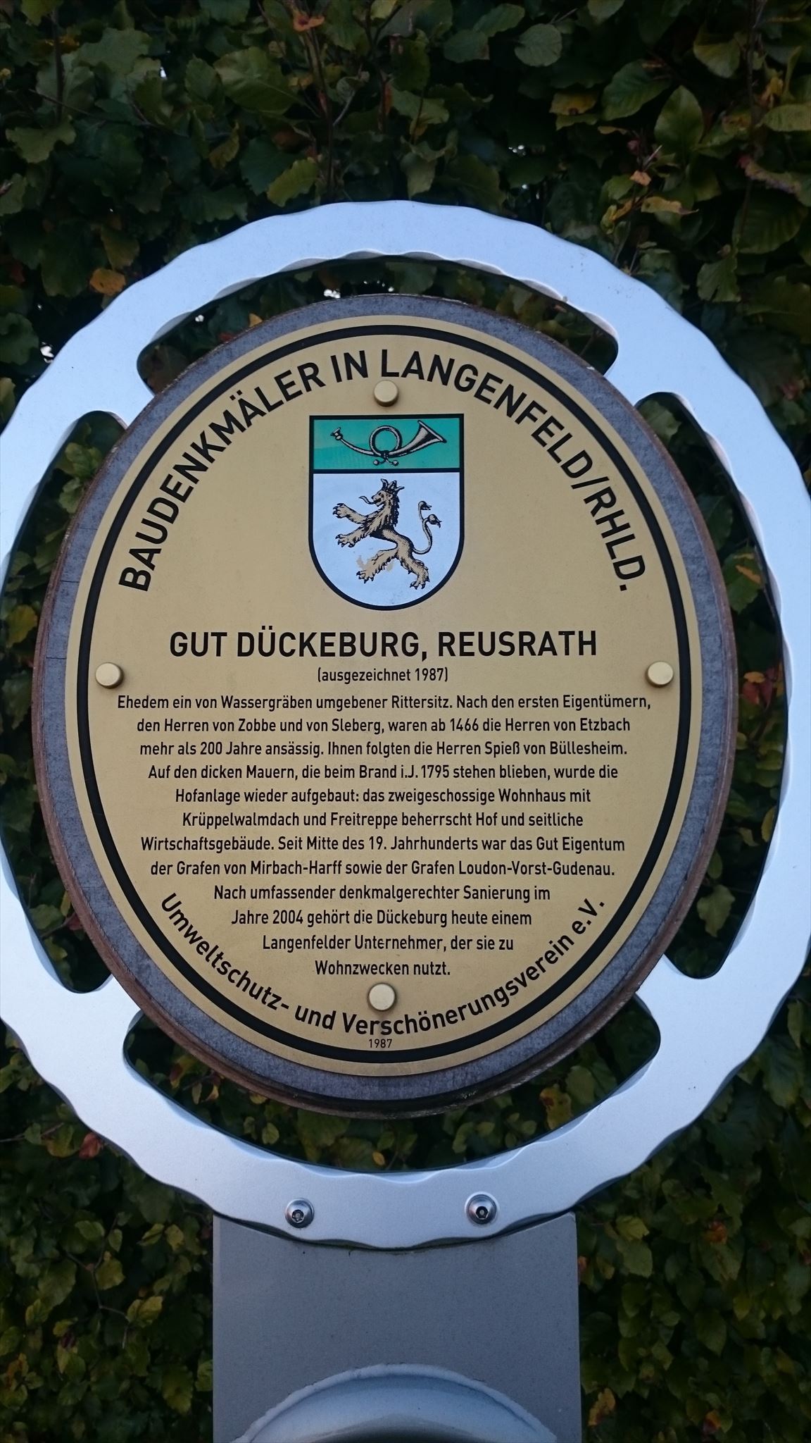 Gut Dückeburg ist ursprünglich ein von Wassergräben umgebener Rittersitz. Nach den ersten Eigentümern, den Herren von Zobbe und von Sleberg, waren ab 1466 die Herren von Etzbach mehr als 200 Jahre ansässig, gefolgt von den Herren von Büllesheim. Auf den Mauern, die beim Brand im Jahre 1795 stehen blieben, wurde die Hofanlage wieder aufgebaut. Das zweigeschossige Wohnhaus mit Krüppelwalmdach und Freitreppe beherrscht Hof und seitliche Wirtschaftsgebäude. Seit 1829 war das Gut Eigentum der Grafen von Mirbach zu Harff sowie deren Erben.