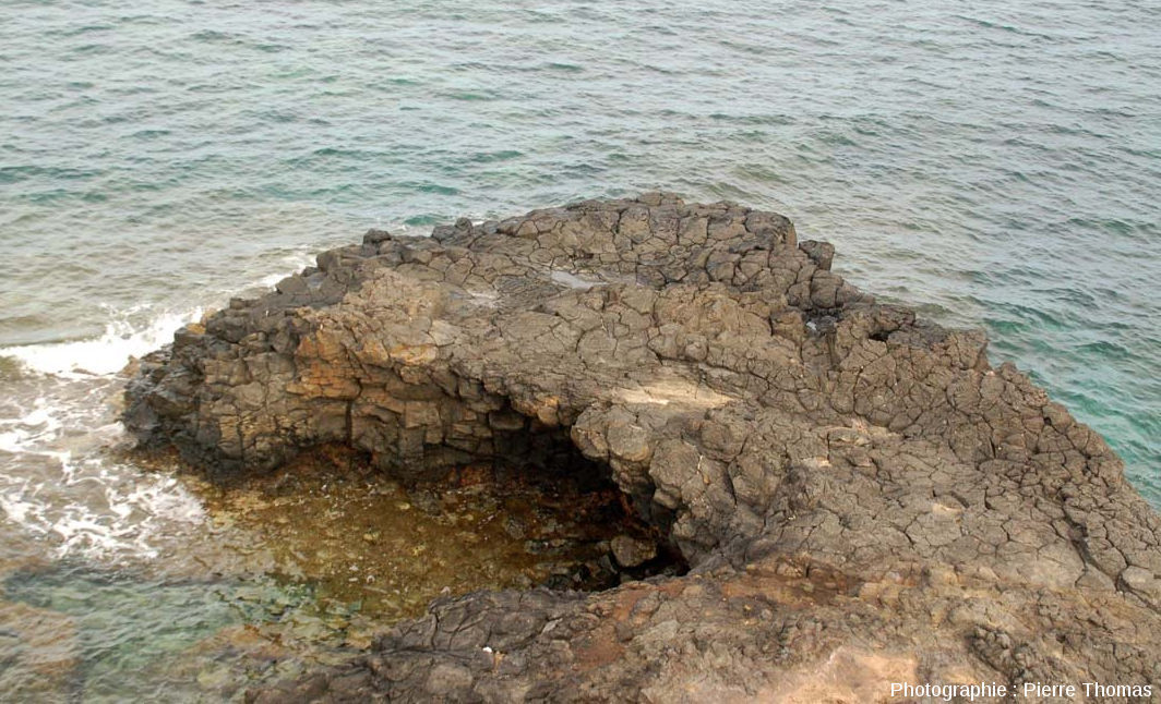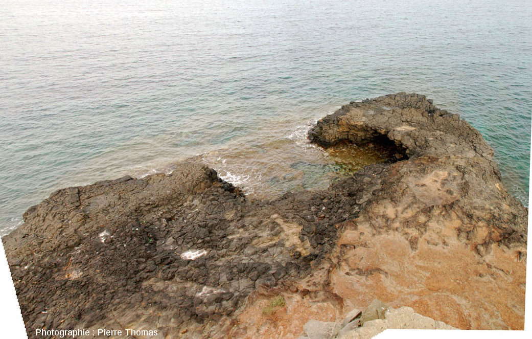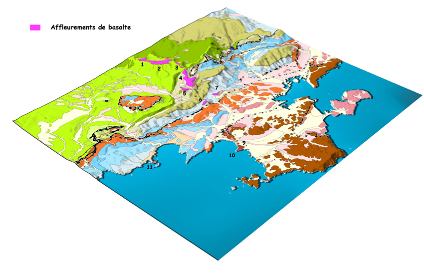 It can be noted first of all that this outcrop of "Pointe Nègre", where the basalt is only a small surface area of 500 mx 100 m, is only a small piece of a much larger basalt flow mostly eroded. There is 13 km between the upstream part of the flows to the north ("Rocher de l'Aigle" and "Pas de la Masque" where the dikes also outcrop) and "Pointe Nègre", to the South.