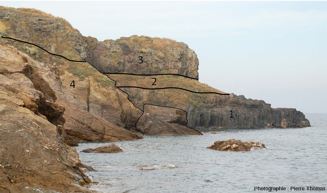 The lower flow is clearly prismed, the upper flow more coarsely. These two flows are separated by a level of reddish basaltic pyroclastites. These two superimposed flows fill an old valley that existed there 6 Mya. This paleo-valley cuts the local Hercynian basement, here made up of metamorphosed rocks weakly metamorphic, the phyllades of "Cap Sicié". The upper flow is significantly wider than the lower flow, and rests directly on the east base of the cape. This recent volcanism is a very good example of a not wellknown volcanism in metropolitan France.