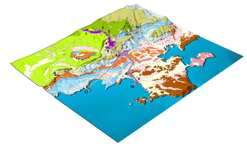 We can try to reconstitute the flows which would have been effected in an old valley parallel to the current "Destel" and would have crossed by a cluse the "Gros Cerveau" and the "Croupatier"; then separated in 2 main flows at the level of "Sainte Barbe-La Courtine" to then flow into the sea ("Pointe Nègre") or in a lake ("Pointe du Château-Bandol"). Changes in direction of the flows can be explained by the presence of high relief obstructing.