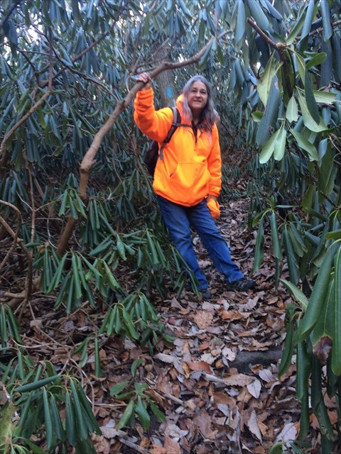As you hike these trails, you will encounter many different trees and plants. In this area, you will encounter groves of rhododendrons (Rhododendron maximum sometimes called Rosebay Rhododendron). These are normally considered shrubs, but in this area, they are small to medium trees. They are evergreens with leathery leaves. They have large showy flowers in late spring.