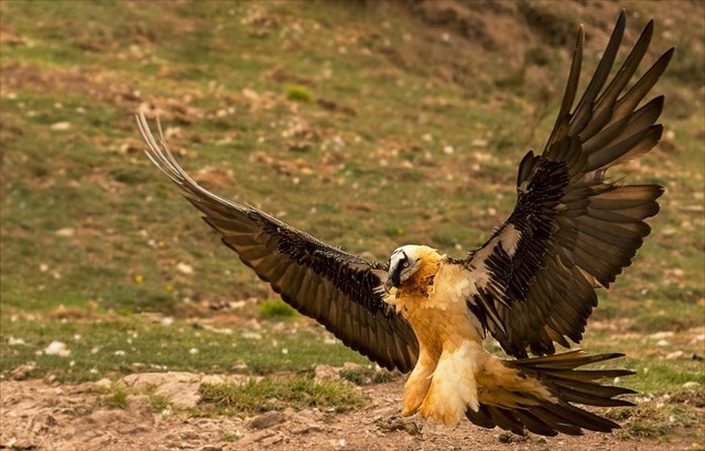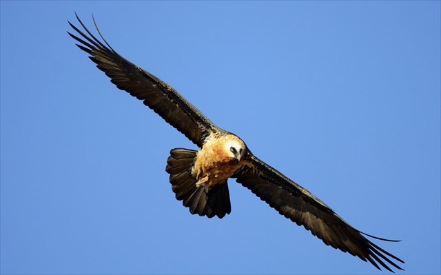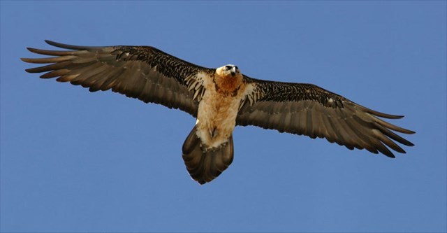 Unlike most other vultures, bearded vultures are not bald. They are quite large birds and are 95-125 cm in length and with 235-280 cm wingspan. They weigh between 5 and 7 kg.