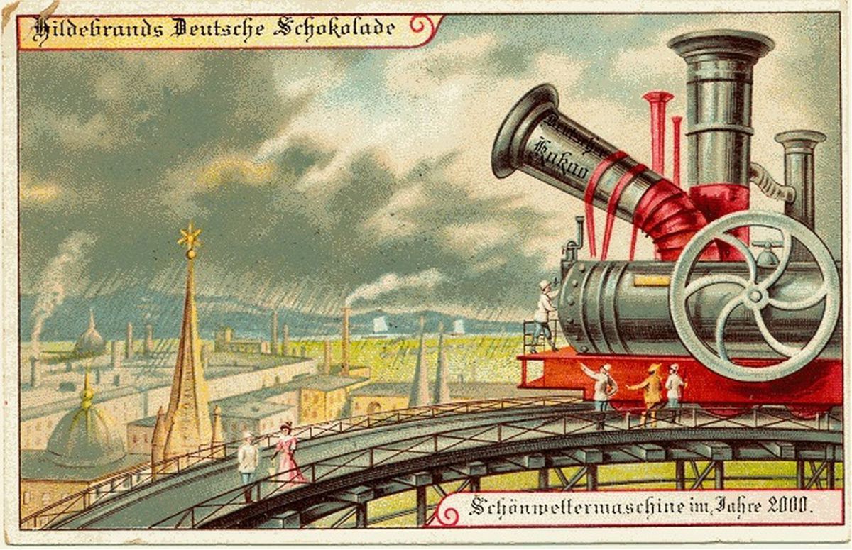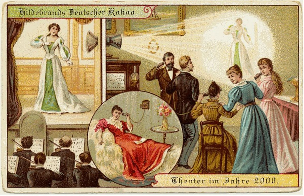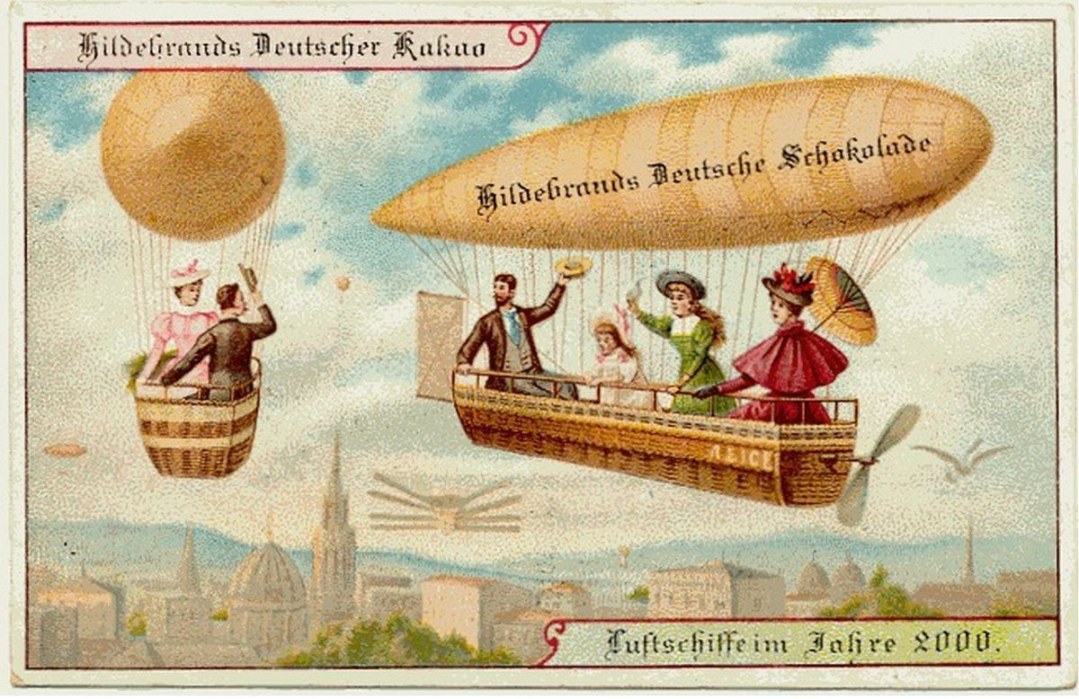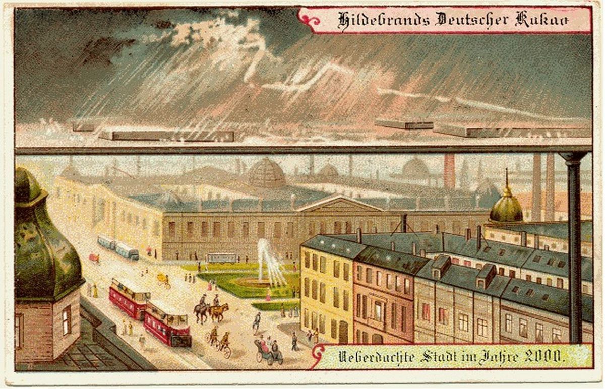 Série pohlednic představující život v roce 2000 nechala vytisknout německá továrna na čokoládu Hildebrands v roce 1900. Optimistické vyobrazení představuje lidi ve viktoriánském oblečení, kteří se těší životu bez hranic a pohodlí, které jim umožnilo sto let technologického pokroku. Předpokládané inovace se pohybují od přesných (pohyblivé chodníky či živé vysílání her) až po absurdní (město pokryté střechou odolné proti povětrnostním vlivům či letní prázdniny na severním pólu).