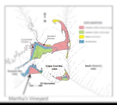 The Wisconsin Glacial Stage is the best known and most recent of the glaciers that affected North America and helped establish its landscape. At one point in time, ice covered most of Canada, the Upper Midwest and New England as well as parts of Montana and Washington state. Nantucket, Martha’s Vineyard and other Massachusetts’ islands such as the Elizabeth Islands and Rhode Island’s Block Island were formed by moraines (sediment ridges) left by the retreating glacier. The current landscape of Martha’s Vineyard was created at the junction of two glacial lobes (or ‘fingers’): The Buzzard’s Bay Lobe and the Cape Cod Lobe. The pictures below highlight both lobes, and where they meet on the Vineyard; near the formation of the ‘V’-shaped inlet of Vineyard Harbor in Tisbury.