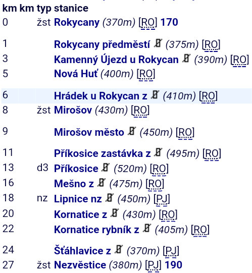 Trať je vedena v jízdním řádu Českých drah pod číslem 175 a je spojkou dvou hlavních tratí - Praha - Plzeň a České Budějovice - Plzeň. Trať je dlouhá 26,6 km, nejvyšší stoupání je 24 promile a nejvyšší stanicí jsou Příkosice (520 m.n.m.).