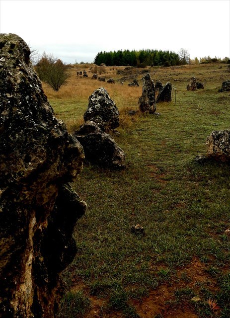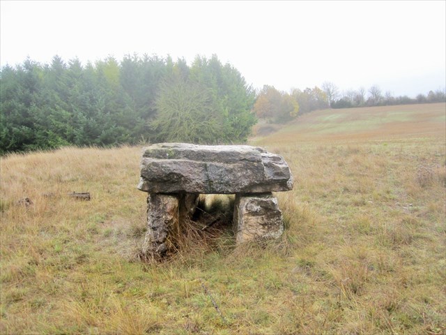 En bordure de la D809 (ex N9) on trouve une "plantation de menhirs". En effet plus d'une centaine de pierres levées voisinent avec un dolmen. Je pense qu'il s'agit de pierres récupérées lors de la construction de l'autoroute. La boîte est planquée au pied d'un menhir.Il va falloir découvrir lequel en résolvant un problème de géométrie bien connu depuis l'antiquité.