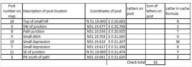 There are 25 POC control posts in the park but you only have to find eight of them in the suggested order in the table below. The listed coordinates take you to the first one. The posts look like the picture above, each has the number on the map so you know have found the right one. It also has 2 letters. When you find the post, note down the letters, turn them into numbers and add them together. For example post no 17 in the picture has the letters AL. This would be 1 +12 = 13.