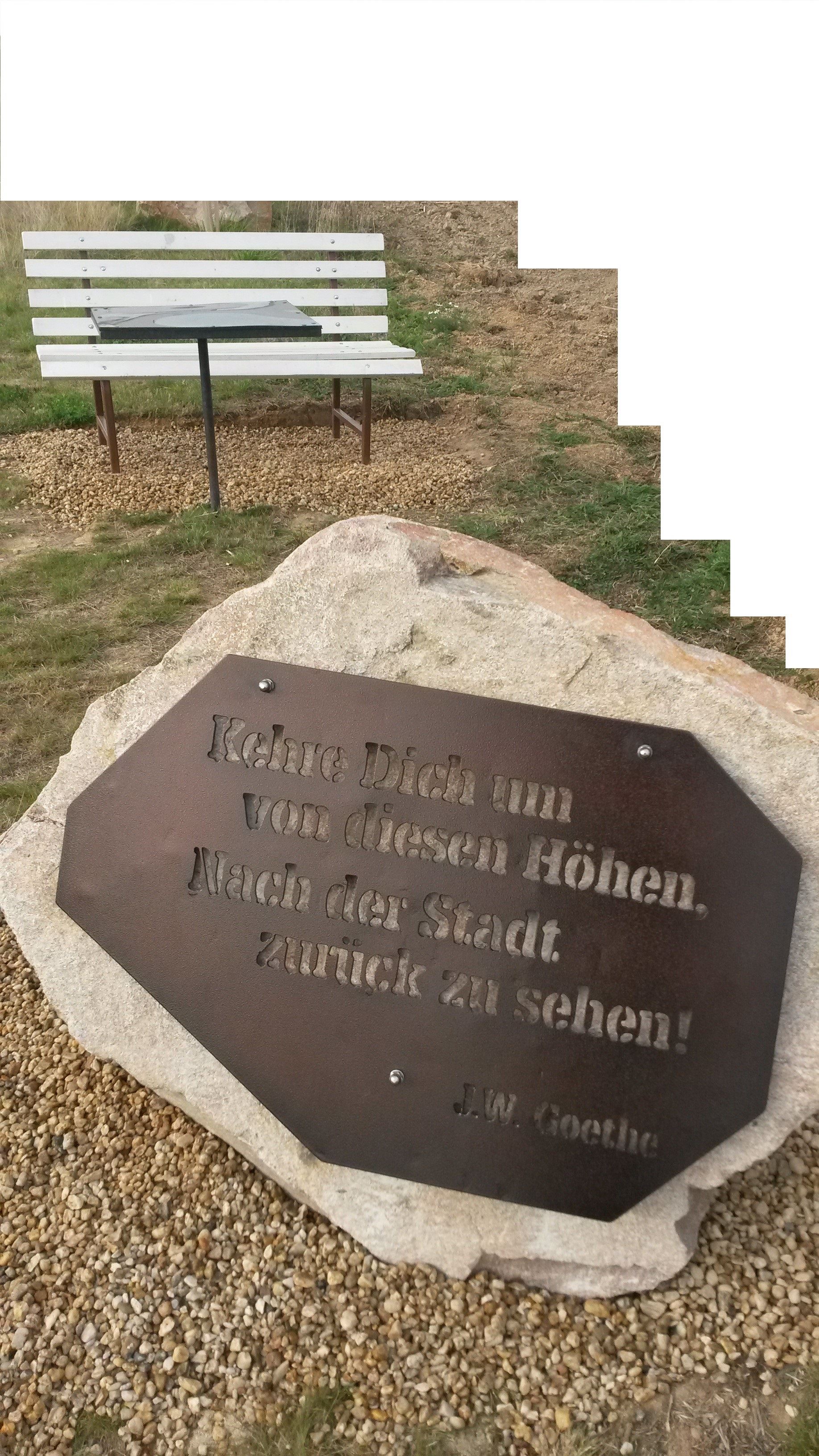 Also dachten sich zwei engagierte Gesauer Bürger ( die auch die Brücke am Grinthbach installierten), dass man diesen schönen Aussichtpunkt weiter prägen sollte. So wurde hier 2017 erst ein kleiner Tisch und später ein stattlicher Felsbrocken mit einer Metalltafel positioniert. Auf dieser Tafel sind die Worte von J.W. Geothe zu lesen, welche einst das Radfahrerdenkmal in Höckendorf zierten: