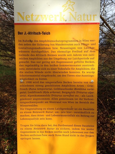 Der Afritschteich ist ein geschütztes Biotop und liegt am Rande der Afritschwiese im Hörndlwald. Dieser Teil des Wienerwaldes sollte einer Reha-Klinik weichen, was Gott sei Dank aufgrund des artengeschützten Juchtenkäfers und dem massiven Widerstand der Bevölkerung verhindert werden konnte. Eine Gedenkstätte dazu findest du direkt auf der Wiese!