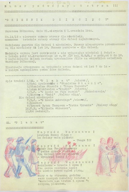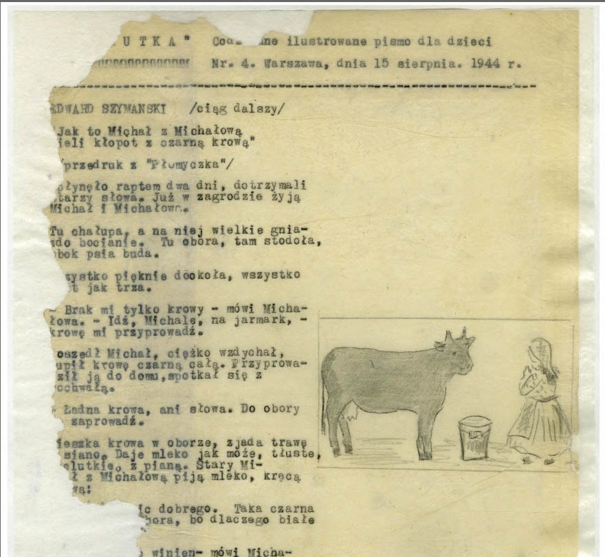 W okresie powstania zostałam powołana przez Starostwo Żoliborz (...) na opiekunkę dzieci osiedla WSM. W tym samym czasie (chyba po drugiej połowie sierpnia 1944) Andrzej Nowicki, mieszkający tak jak i ja na IV Kolonii WSM, ul. Krasińskiego 18, wystąpił z projektem wydawania dla dzieci codziennego pisma, w celu zainteresowania malców lekturą i uchronienia w ten sposób od grożących im na podwórku pocisków. Projekt wydał się nam zrazu mało realny do wykonania, choć w zasadzie słuszny, tym słuszniejszy, że należało starsze dzieci rzeczowo informować o tym, co się wokół nich dzieje. Słuszność motywów zwyciężyła. Powstał komitet redakcyjny, w skład którego weszła dr Janina Przeworska, Maria Kownacka, dr Zofia Bohuszewicz, Andrzej Nowicki i ja”