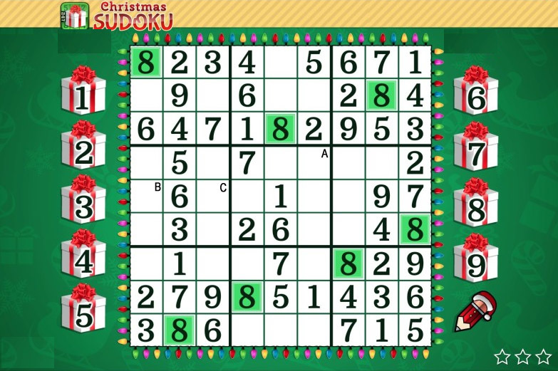 Löse das Sudoku und weise A, B, C die entsprechenden Zahlenwerte zu.