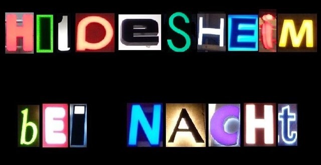 Sucht die oben abgebildeten Buchstaben des Schriftzuges "Hildesheim bei Nacht" in den Leuchtreklamen der Geschäfte und beantwortet die Fragen zu den Buchstaben aus der folgenden Tabelle.