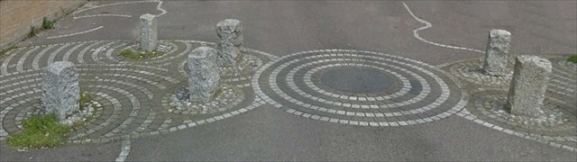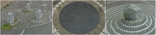The H-shaped 'streetscape' is divided into twenty areas enhanced using different combinations of: small standing stones- standing stones emerging from stripey traffic islands- elliptical raised pattern areas- and circular stone plaques. All these features (apart from the arrangements of standing stones) incorporate typographic inscriptions - sometimes simple- sometimes very detailed and complex - which reference the vicinity but also create further conceptual possibilities. The textual features are realized as raised lettering in granite created by modern sand-blasting techniques