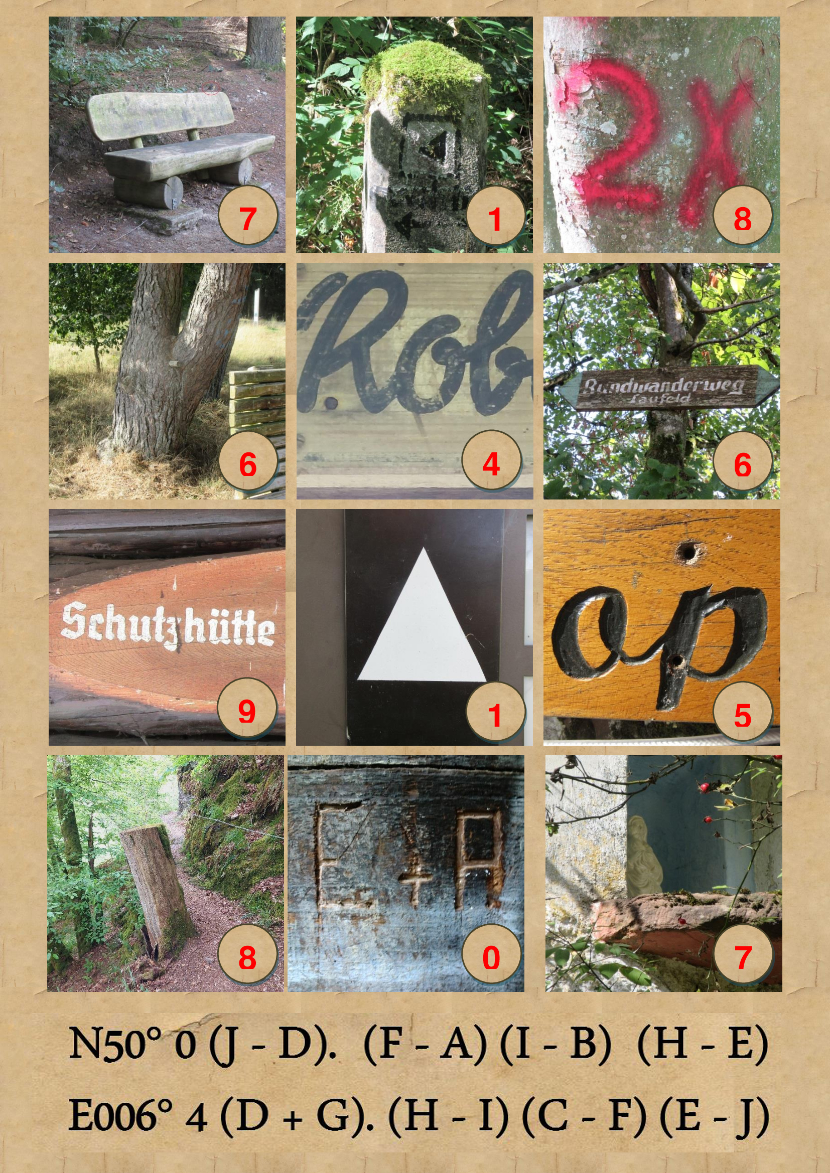An den Wegpunkten 0A-0J müsst ihr jeweils ein Foto identifizieren und den Zahlenwert des Bildes dann dem Buchstaben des Wegpunktes zuordnen. Es gibt mehr Fotos als Wegpunkte.
