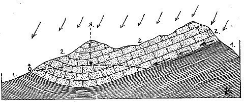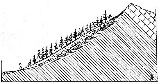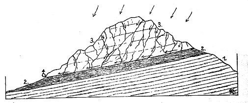 3) Stratified spring: water flows out at the bottom outcrop of sloping contact surface between impervious layers (2) and pervious cracked rock (3).