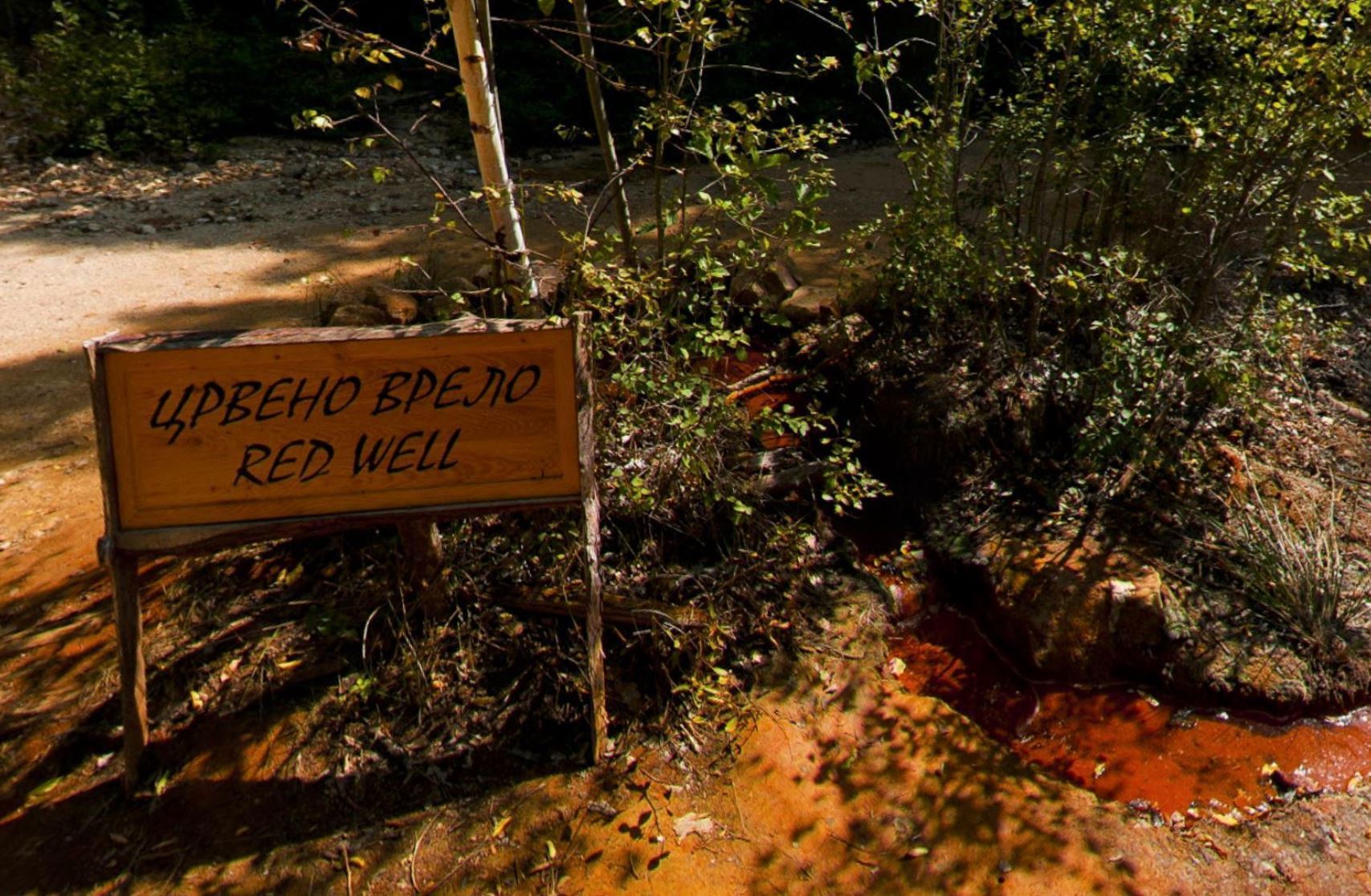 Red Well (Crveno vrelo) is another spring located downstream, in the alluvial plain, 400 m away from the first spring. Its water (pH 3.5) is less acid and has a lower general mineral concentration (4.372 mg/l of water). Because of the flat terrain, its water overflows in a very thin layer and runs into a bed of the nearby yellow stream. Due to the oxidation of iron, which is contained in water in large amounts, an attractive red terrace in the form of a fan is created.