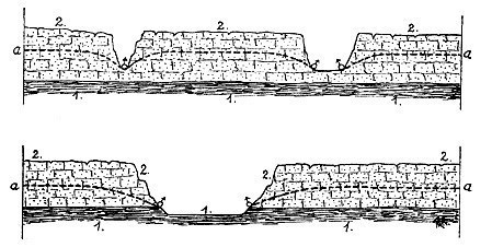 (1) nepropusni sloj, (2) propusni sloj, (a) gornja granica podzemne vode