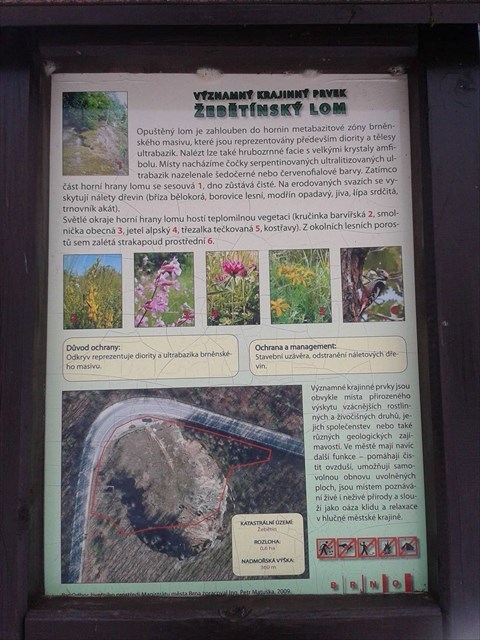 Opuštěný lom je zahlouben do hornin metabazitové zóny brněnského masivu. Žije a roste zde spoustu vzácných živočichů a rostlin. Například strakapoud a z rostlin jetel alpský. Rozloha lomu je 0,6 ha a Nadmořská výška 360 m.