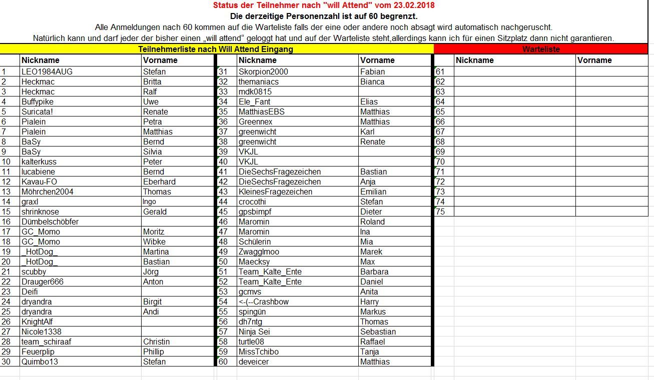 Ich würde dann in der Eventteilnehmerliste sowohl Cacher wir auch Vornamen aufnehmen und unter dem Event veröffentlichen. Ich würde mich freuen, wenn der Vorschlag bei euch ebenfalls auf Anklang finden würde.