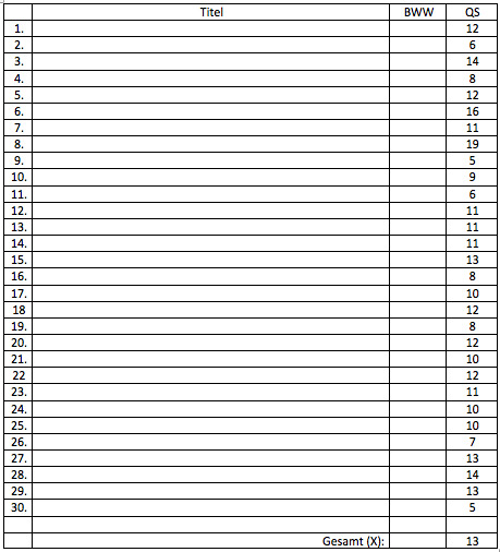 Prima! Dann wandle die Titel der Lieder ganz einfach um und trage den Buchstabenwortwert (BWW) in die unten stehende Tabelle.