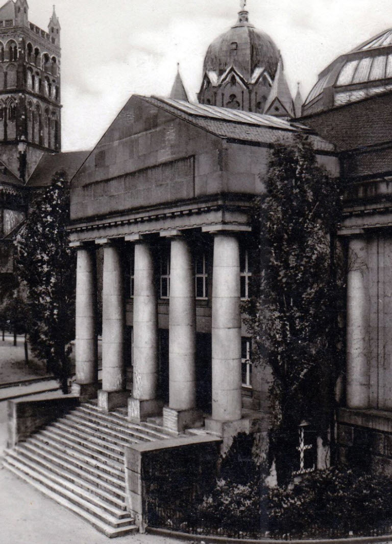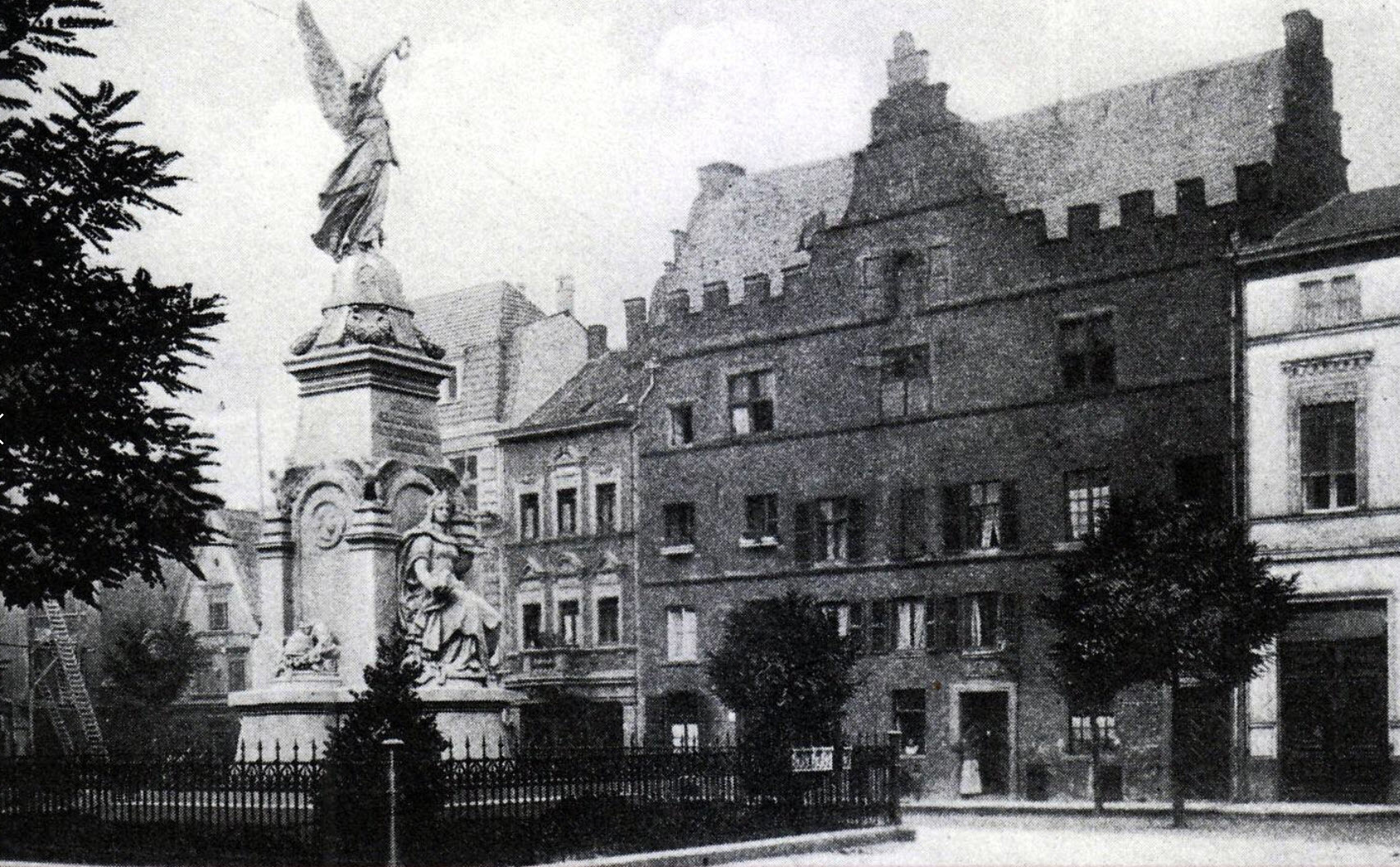 Das Kriegerdenkmal an seinem ursprünglichen Platz. Es wurde später auf dem Gartenplatz (heute Platz am Niedertor) aufgestellt. Dort wurde es im Krieg zerstört. Überreste des Denkmals befinden sich am Ehrendenkmal auf dem Neusser Hauptfriedhof. Im Hintergrund sieht man das heute noch erhaltene: