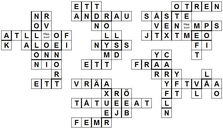 Här är fem bilder på strukturer som bildar 3-D-Tetris-figurer. Du får själv skriva ut/av, klippa ut, vika vid de fetmarkerade strecken samt tejpa ihop blocken. Ett typiskt julpyssel, m.a.o. Tillsammans ska dessa block forma en 3*3*3-kub. Observera att det finns två rutor som ser ut som om de ingår, men ska klippas bort, de är uppmärkta.