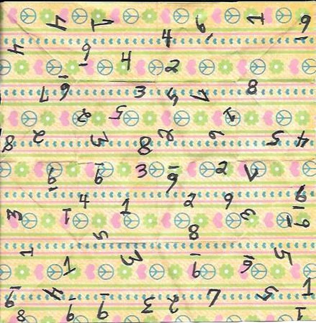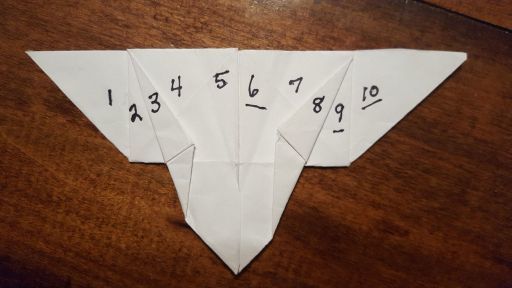 Try to make your folds precise so that the numbers will appear correctly. Also, don't get frustrated if your first attempt does not work out. The first permanent folds (#7 and #8) have to come from the right direction. It's a toss-up picking which of those four edges to fold. Here is an example of where the correct numbers will reveal themselves: