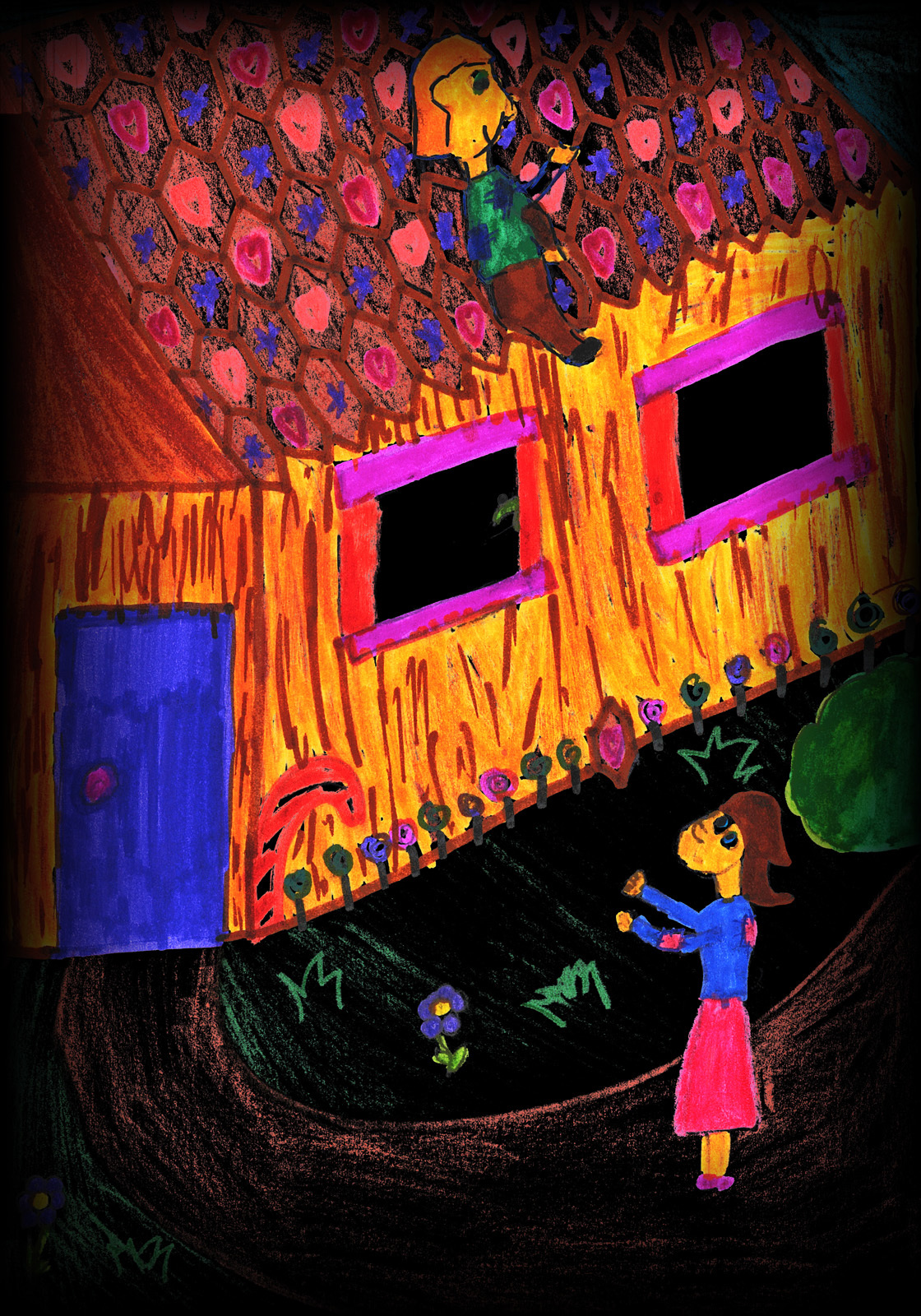 Pohlédly vzhůru do větví a v ten moment se před nimi zjevila podivná chaloupka. Byla celá malovaná a voňavá, protože byla z perníku. Jeníček nejdříve vylezl na strom, aby z větví chaloupku Mařence zpřístupnil. Pak ale neodolal a uloupl si... A tu se najednou z chaloupky ozvalo: "Kdopak mi to tady loupe perníček?"
