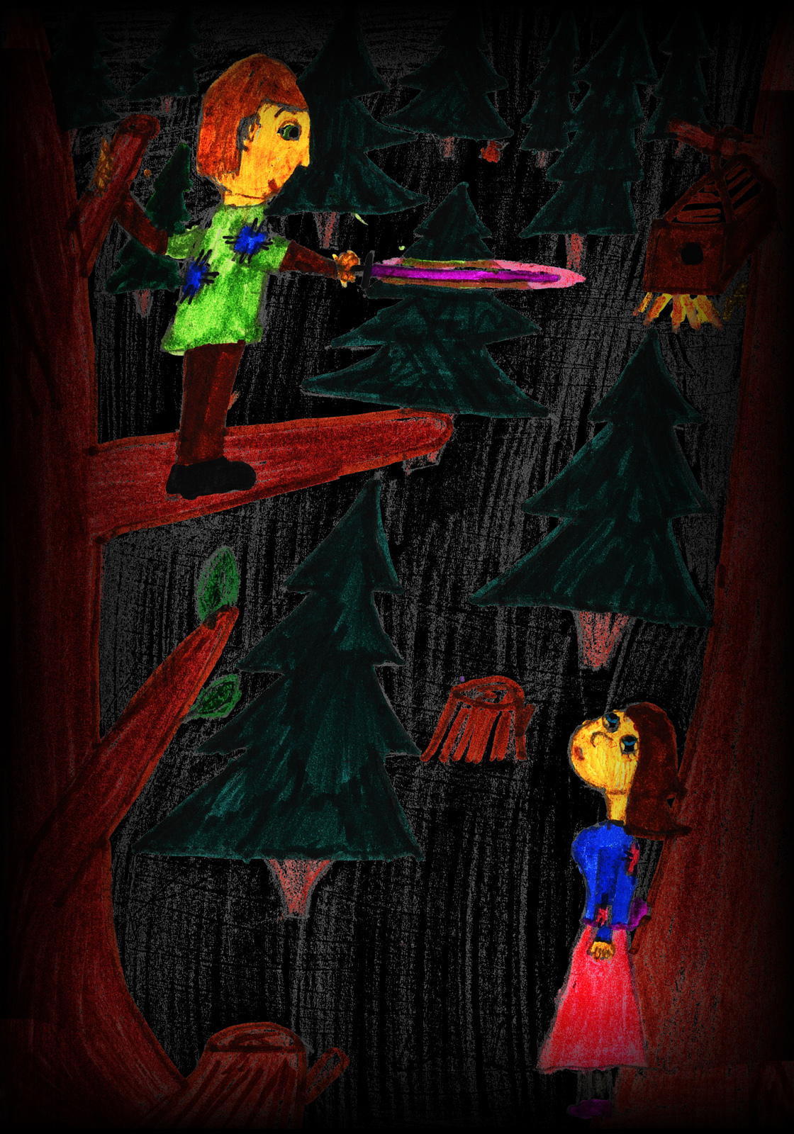 Fakt jo? Aha, dobrá tedy, tak ono to jen vypadalo jako světelný meč ze Star Wars, ve skutečnosti to bylo kouzelné laserové ukazovátko. Jeníček s ním začal divoce mířit všude kolem sebe, až zaostřil na ptačí budku, připevněnou na stromě s červenými světluškami. A v ten moment Mařenka, stojící pod tímž stromem, zvolala: "Jendo, slez dolů. Už vím, kam pokračujeme!"